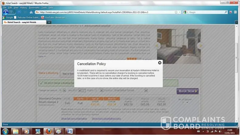 Hello, I made a booking in December 2010 with Aadam Wilhemina Hotel in Amsterdam inthe web page of easy jet. In that web they said in the policy of cancellation "A credit/debit card is required to secure your reservation at Aadam Wilhelmina Hotel in Amsterdam. There will be no cancellation charge if a booking is cancelled before 10:00 hotel local time 5 days before your date of arrival. If the booking is cancelled later, or in the case of a no-show, the entire stay will be charged". But was FALSE, they took the money from my account in December 2010. Then I could not get the schengen visa and I could not go there. I tried to cancel the booking, and take back my money (154 pounds) but the hotel did not want to back the money, and EASYJET either .