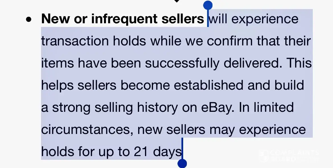 Literally, as soon as an item is listed, it now states that funds are held for two weeks, to make sure there are "no complaints or returns". This is a patently misrepresentation of the actual situation. The items are non-returnable and have a tracking number associated. The seller is not only lied to, the seller is also now inherently liable for usps, ups or fedex mishandling of items. I did not enter the agreement to use their selling vehicle with the understanding that these funds… hundreds of dollars would be arbitrarily held for two weeks. And if one does not use eBay shipping labels, the seller covers all shipping fees out of pocket prior to the two-week mandatory hold period. I have 100% rating and have spent hundreds of thousands on thousands of items… this is simple and clear misrepresentation of a contract prior to using their platform.