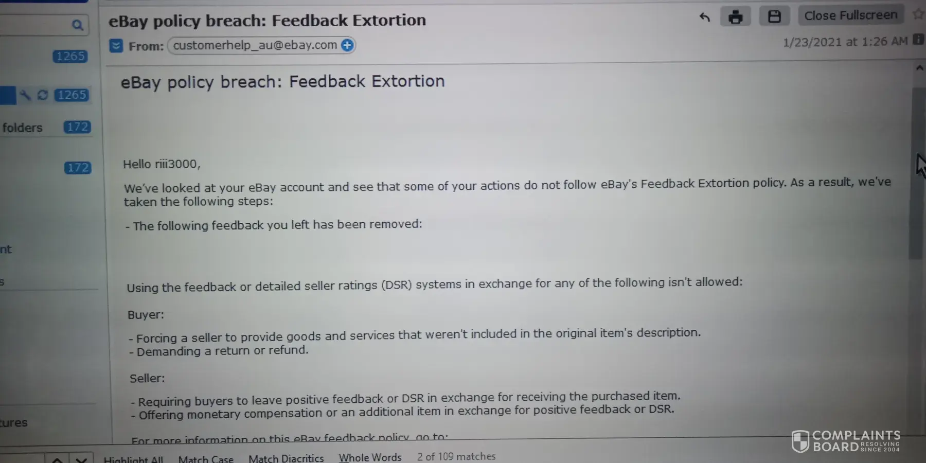 I purchased and paid for an item. I later received an email from the seller (not threw ebay) requesting more money on top of the original postage cost, clearly a breach of ebay's police. The seller cancelled the sale. I left legitimate feed back simply stating (this seller can not be trusted) to which ebay removed the feed back and accused me of extortion.