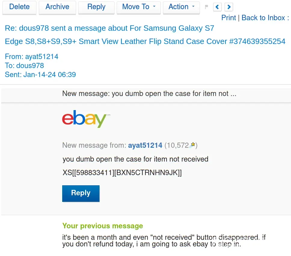 I have purchased many items from E-bay without difficulty from a seller or E-bay and I am pleased with the quality of service I have received in the past. I hope that you can resolve this issue so that I can comfortable continue to be an E-bay customer. Thank you in advance for your time and anticipated cooperation in this matter.
