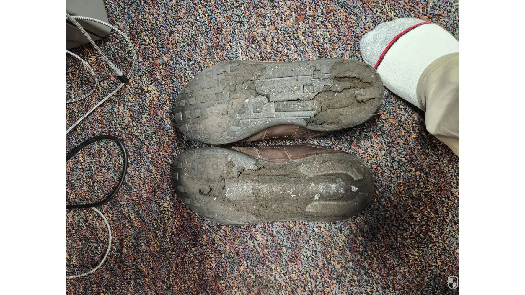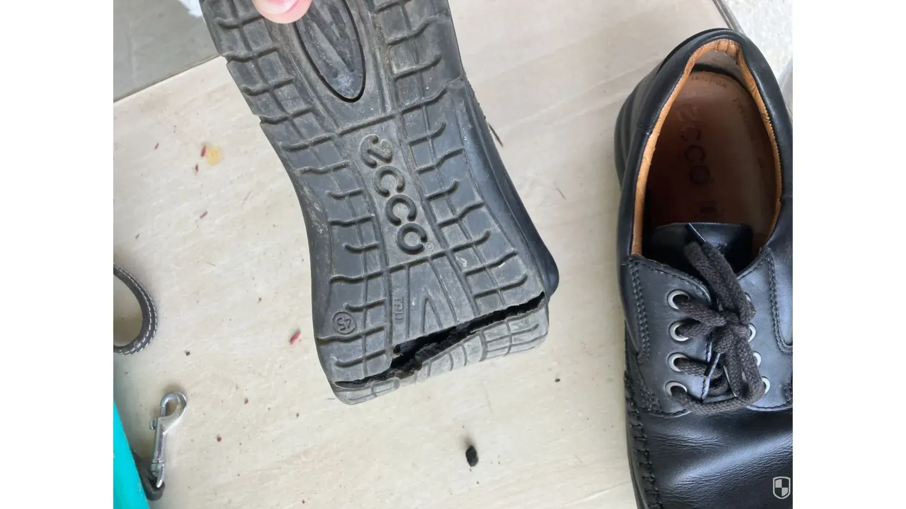 Because today was a really warm day, I decided to wear my Ecco shoes. I was visiting a friend at a residence. As I entered her room, I noticed black pieces all over the floor. At first I thought it was earth from outside. Then I realized that soles of my shoes were disintegrating. I tried to remove as much as I could, but then small pieces were all over the floor. Never experienced this. Quite an ordeal getting home.