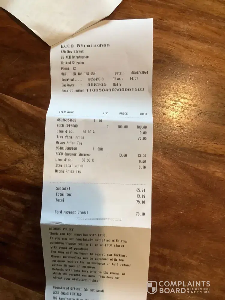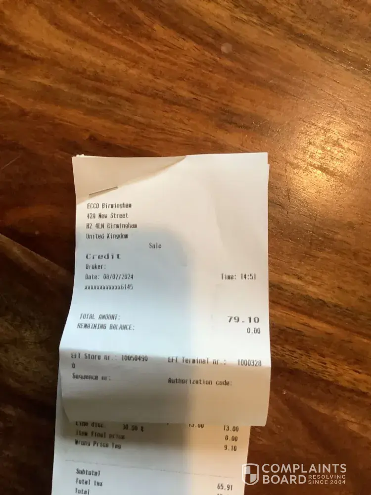 Yesterday, 8th July 2024 I went to the Ecco shop in Birmingham, my new nearest Ecco store. I had phoned Ecco company and they told me that I would have to take them to an Ecco Store. I had thrown the first shoes, a trainer type shoe away but then two others of my Ecco shoes did the same thing. The soles completely disintegrated. One shoe was leather top, in...