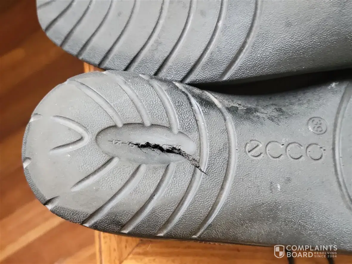 I bought a pair of ECCO boots for $240 (ECCO Sarterelle Tall Buckle Boot 25). I only wore them 3 times, and the second time I wore them the heel on one boot cracked and pieces of black plastic started falling off. The third time I wore them, the sole on the other boat also cracked while walking over some gravel. So I emailed customer service as obviously I...