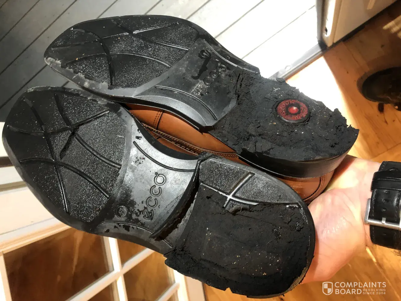 This is my second complaint. My ecco brand dress shoes both cracked and feel apart at the soles. They, too, left blank chunks all over the floor of the site i work in. I had to leave work, whe i commute from home 45 minutes, one way. I had to leave work, drive home, and change shoes, in the middle of my shift, and 45 minutes back to work. Then, i get online ti find out there are several hundred complaints of the same exact occurrences. And, ecco doesn't honor their shoes, or respond to multiple complaints. Never again will i purchase ecco for myself or my entire family.