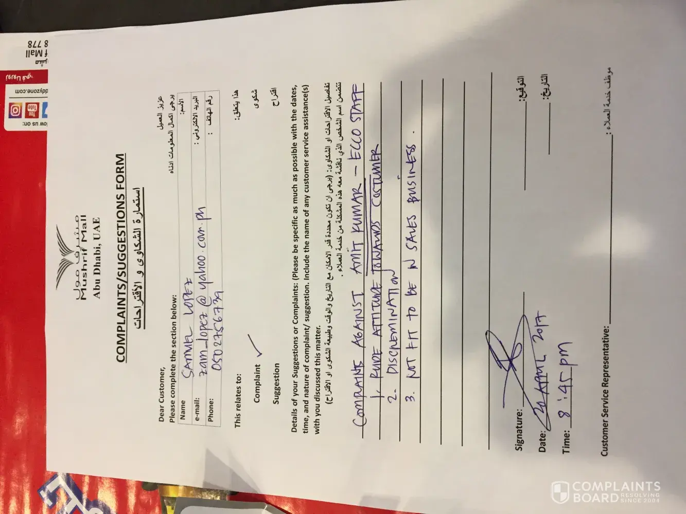 I am writing to make a complaint against one of ECCO sales person namely AMIT KUMAR in Mushrif Mall Abu Dhabi, UAE branch. This person is rude to costumers and we suffer discrimination, this person is not fit to be in sales business (we what this person terminated ASAP). Attached below is the copy of complaint form submitted to Mall Customer service.