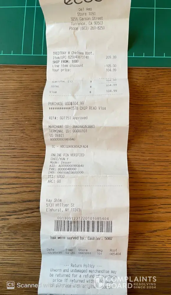 I bought a pair of boots called byway tred from ecco shoes online. They promised if they did not fit they would refund the money on to my visa card. The date was 20/01/2021. On the 25/01/2021 I returned the shoes as required. That was three weeks ago. There customer support did work.