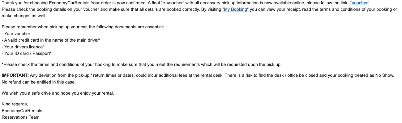 Given number as a point of contact does not exist. No chance to get back money for reservation. This company is simple a scam. I had no chance to book the car coz of this crap, no emails, no vouchers, no confirmation. ECONOMY CAR RENTALS is a SCAM.