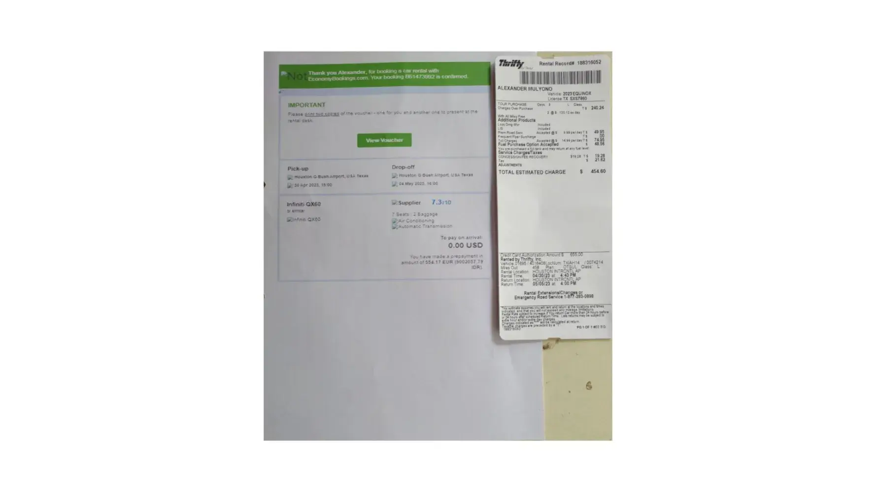 4. Thrift, International Airport of Houston, issued rental record#[protected] for period April 30, 2023 and return on May 5, 2023, estimated amount USD 490.25