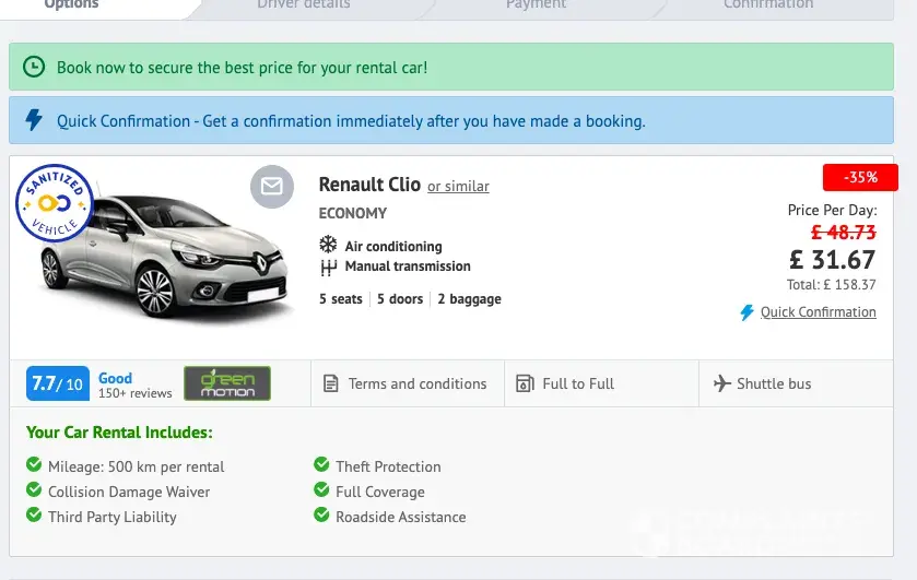 On the economy booking site, I booked a car with insurance, a second driver and a cancellation fee (in case I needed it.)