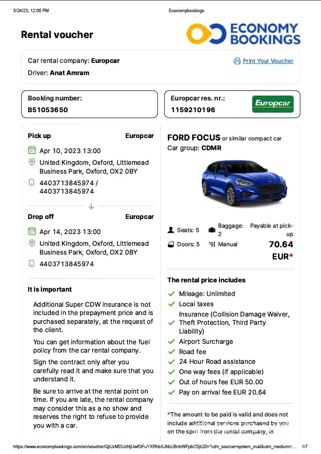 My wife and I had reserved a car to take for Apr 10 at Oxford, England