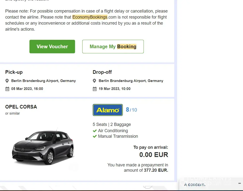 I am wondering if the car's announcement one the website that owns economybooking.com are scam. I noticed on the 05 March 2023 in Berlin Brandenburg Airport, Germany. There were a lot of cheap rental cars from various rental car companies. I booked an Opel Corsa, paid 377.20 Euro via your online payment service.