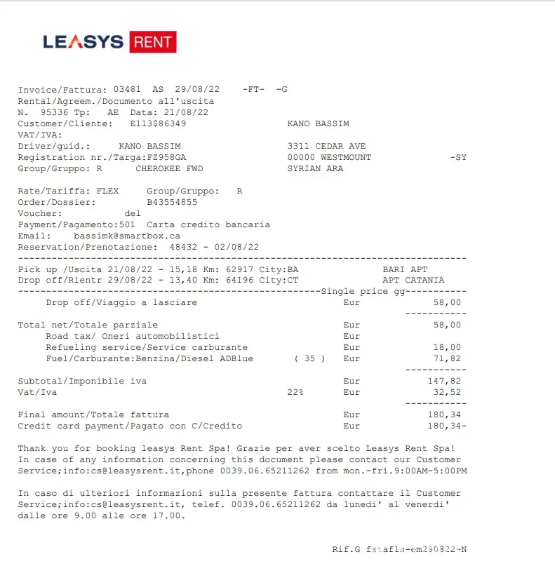 leasys car rental booking B43554855
