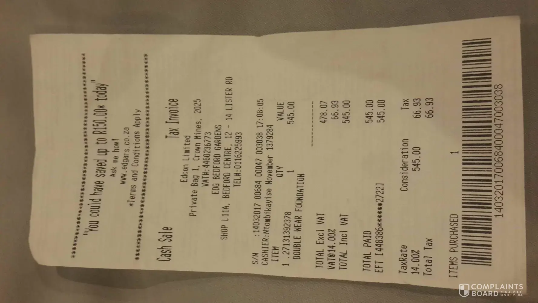 On Tuesday 14 March 2017 i purchased a bottle of Estee Lauder double wear foundation from Edgars Bedford Centre, Bedfordview at 17:08 receipt attached. When I got home that evening I opened the box and noticed the bottle leaked into the packaging, I opened the screw top and saw the top of the bottle was broken. I took photos and immediately filled in an enquiry on Estee Lauder SA website. On Wednesday 15 March 2017 Estee Lauder emailed me and instructed me to take the damaged product back to the store I purchased it at with my receipt so it can be exchanged. On Thursday 16 March 2017 I went back to Edgars in Bedford Centre, the Estee Lauder sales agent was not in and another consultant called the Manager to assist me. Without hearing what I had to say about the product he accused me of dropping/breaking it and said there is no way he will exchange it as Edgars does not sell damaged items.