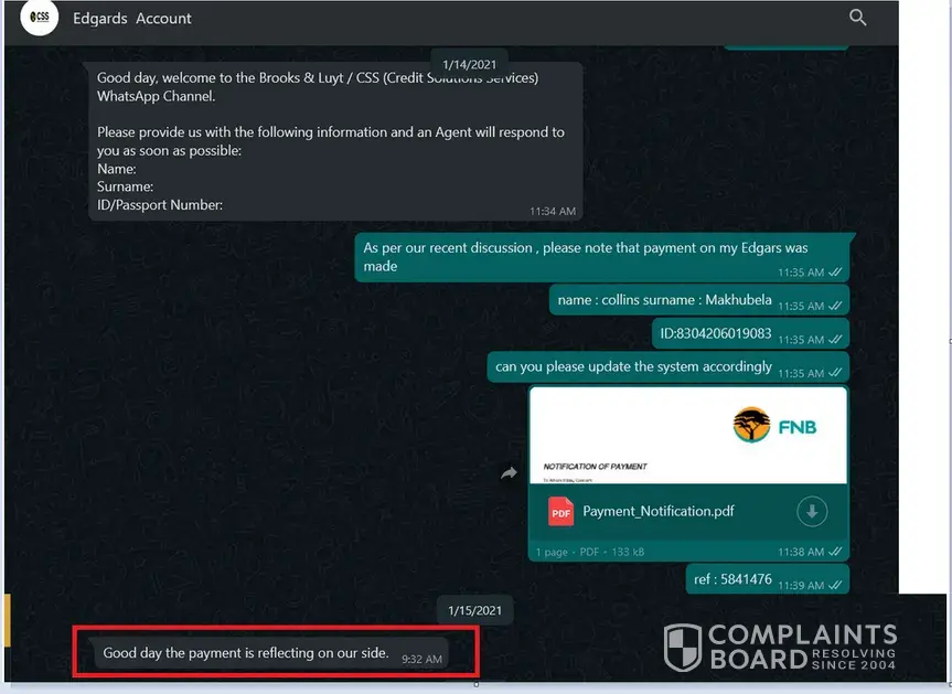 Good day all, I have a huge issue with the Edcon/Edgars/RCS group that I need to address, and hope others will follow suit because it appears that Edgars is now in the business of scamming people, my account fell in arrears sometime in 2020 during the covid19 lockdown period, I received calls from debt collectors ( Brooks & lyt / CSS solution ) on behalf of Edgars and made an arrangement for an amount to R400 from the R886.95 outstanding balance that was outstanding, therefore a day later I proceeded as advised and a minimum of amount R400 was paid on the 14 Jan 2021 and proof of payment was submitted to the debt collector via email & WhatsApp of which the receipt acknowledged, now after I visited the store : Southgate branch to try to pay the remainder balance expected being the difference from the R400 that was paid and to learn that the overdue balance was still reflecting the same R886.95 and I was advised to wait for at least 7 working days to see if the account will be updated once the money was cleared into the Edgars account up until date my account still reflects with the same balance and nobody can account the payment that was made to the debt collectors on behalf of Edgars, I went to the store and I was advised to contact all the parties involved vvm, rcs group, brooks & lyt/css solutions including edcon but I am currently caught in-between turmoil with nobody taking into account of the payment that was made even after Brooks & lyt acknowledged the payment on behalf Edgars has left me to play detective in tracking the payment although there's concrete proof from my bank on where the money was paid to reflecting the full details of the payment to and from including the amount paid but to date I am being sent from pillar to post, it appears that the money has vanished into thin air, I have tried several channels to communicate with the relevant parties to assist in this matter but as usual i receive no feedback nor response on this matter, I am really tired and irate on this matter and all I need is a way forward so that I can pay the remainder balance and close the account, I can be contacted on [protected]