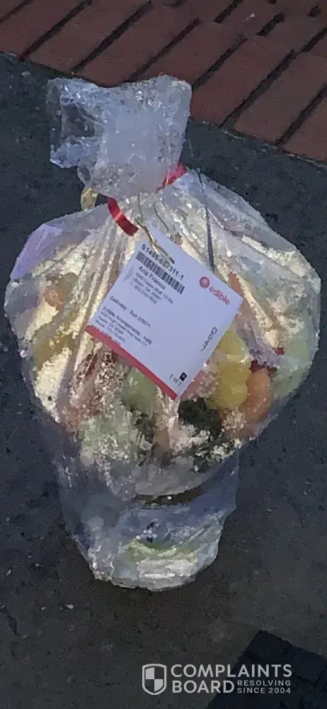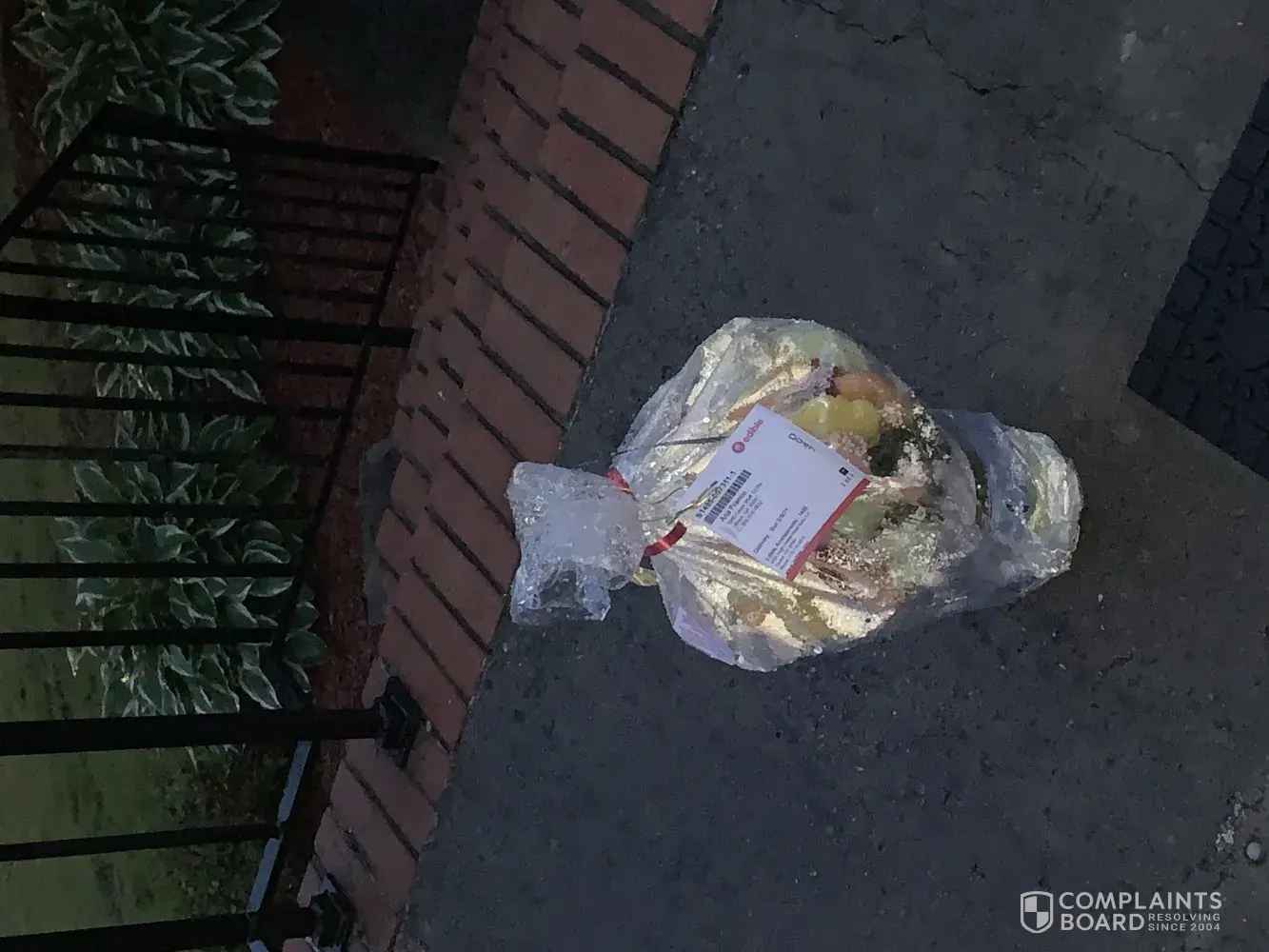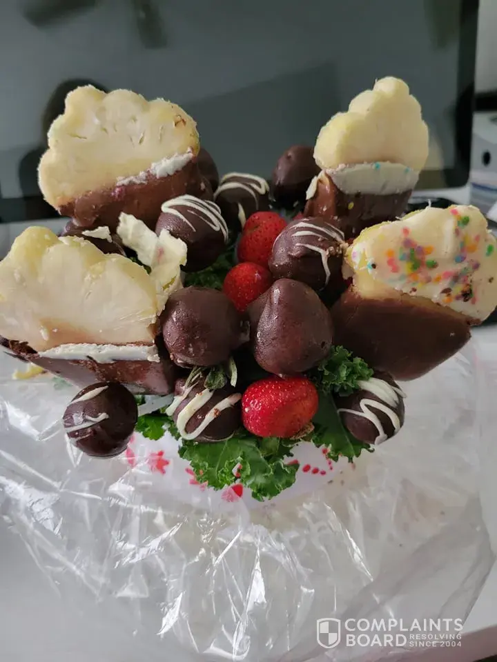 informed by the recipient that her edibles were left outside and by the time she got to her arrangements, the fruit was no longer good. (It was left outside in 80-degree weather)