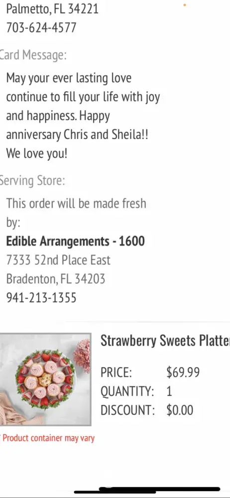 Item was ordered online, never delivered on date I paid for, had to go to the shop to get arrangements and when picked up Pineapple was bad and old, the chocolate on them was falling off and not edible. store never answered the phone calls, then after I picked up the arrangements i get an email saying that the arrangement was successfully delivered. The chocolate covered strawberries were supposed to have pink swirls I paid an additional 5.00 for. but this one had white swirls which is free. I am totally never using edible arrangements again if this is not rectified. 93.00 for an arrangement that half of it was inedible.