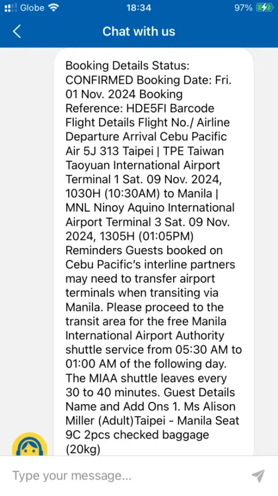 Flight booking - HDE5FI Flight - Taipei to Manila Flexible flight ticket plus additional baggage included in the cost. (1) First I decided to change the flight date. Flight ticket was flexible, I went online to change the date, chose a new date that was showing no additional cost would be incurred for that change. I submitted the change request. After 24...