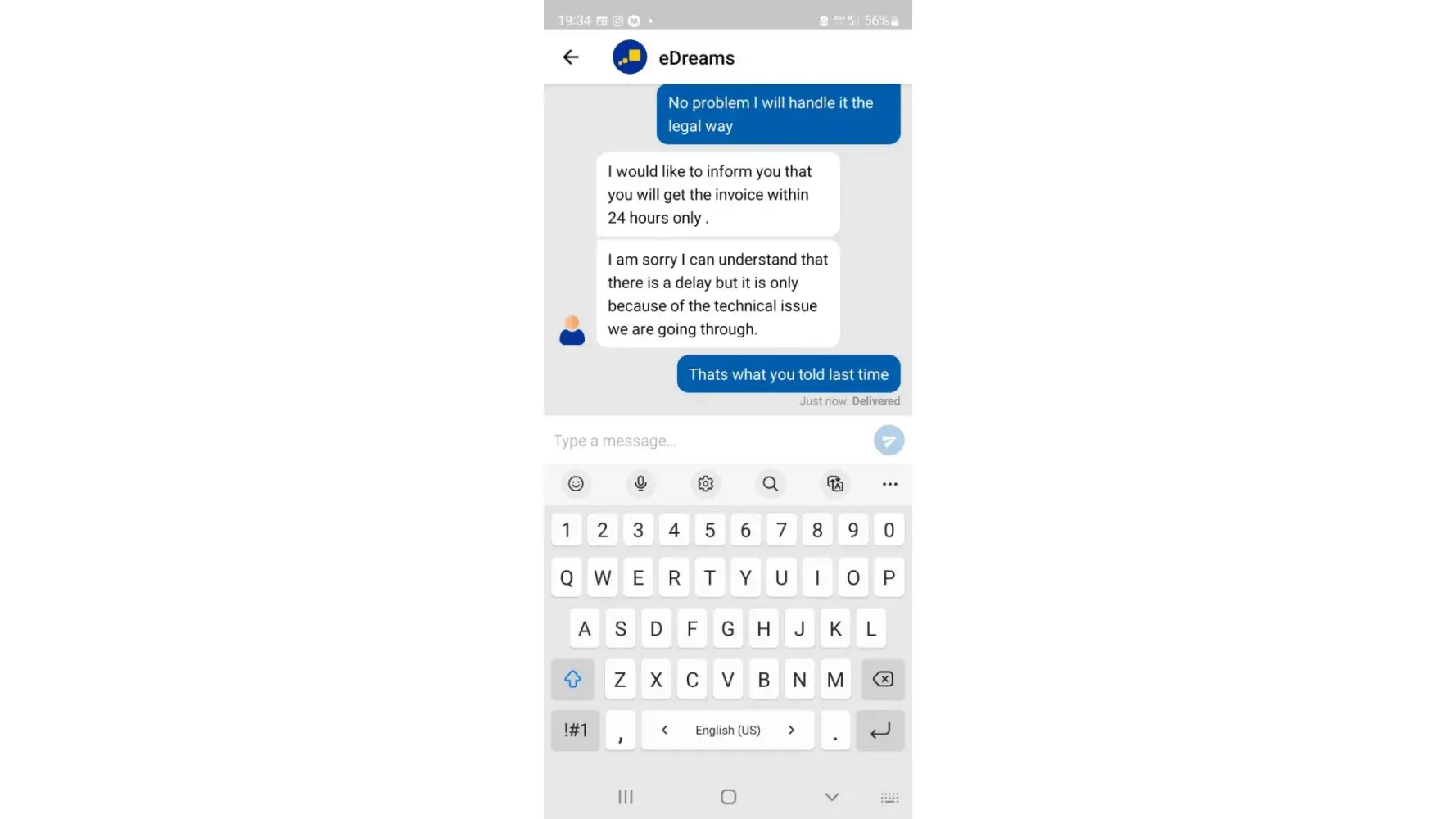 On the 19th of August I had flight to Dublin which had been ordered via eDreams. After I arrived, I have requested via their app to send me the the invoice several time as I have to be reimbursed by my employer on that trip. I didnt get it. Approached them via the chat and although I was promised to get it by their rep within 24 hours (called Amit Roy) - I didn't get it. Tried a day later where I was promised to get it within 24 hours. Didn't get it. Afterwards they came up with stories that there are "technical issues". Bottom line - they don't send the invoice on time and I guess there is a reason for that. This is completely illegal.