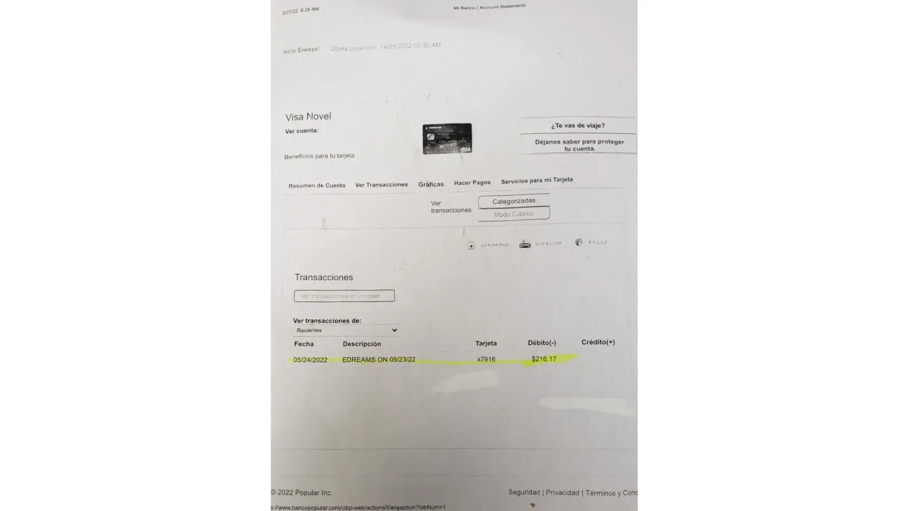 Charges of $216.17 was made to visa credit card on may 24,2022