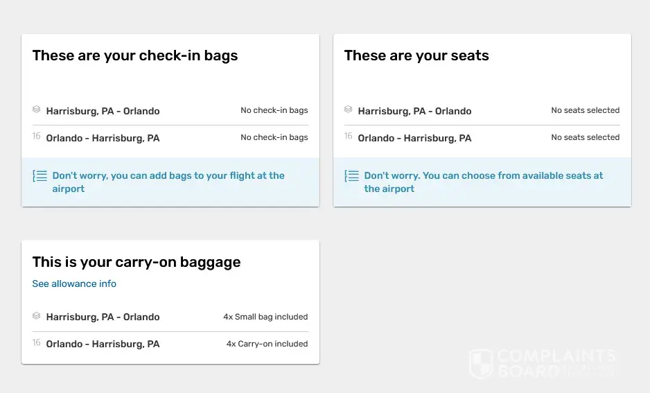 While booking my flight on the edreams site beside the flights you had to chose from it said carry on included. The email from edreams says 4 carry on bags both directions. The airline website says no baggage. I have screen shots of the flight listings saying carry on included. I have screen shots of my edreams account saying carry on included. I changed one flight because it said small bag included. I have chatted many times, filled out the forms they asked for, sent info they requested and no one has gotten back to me in 17 days. Has anyone found a solution?