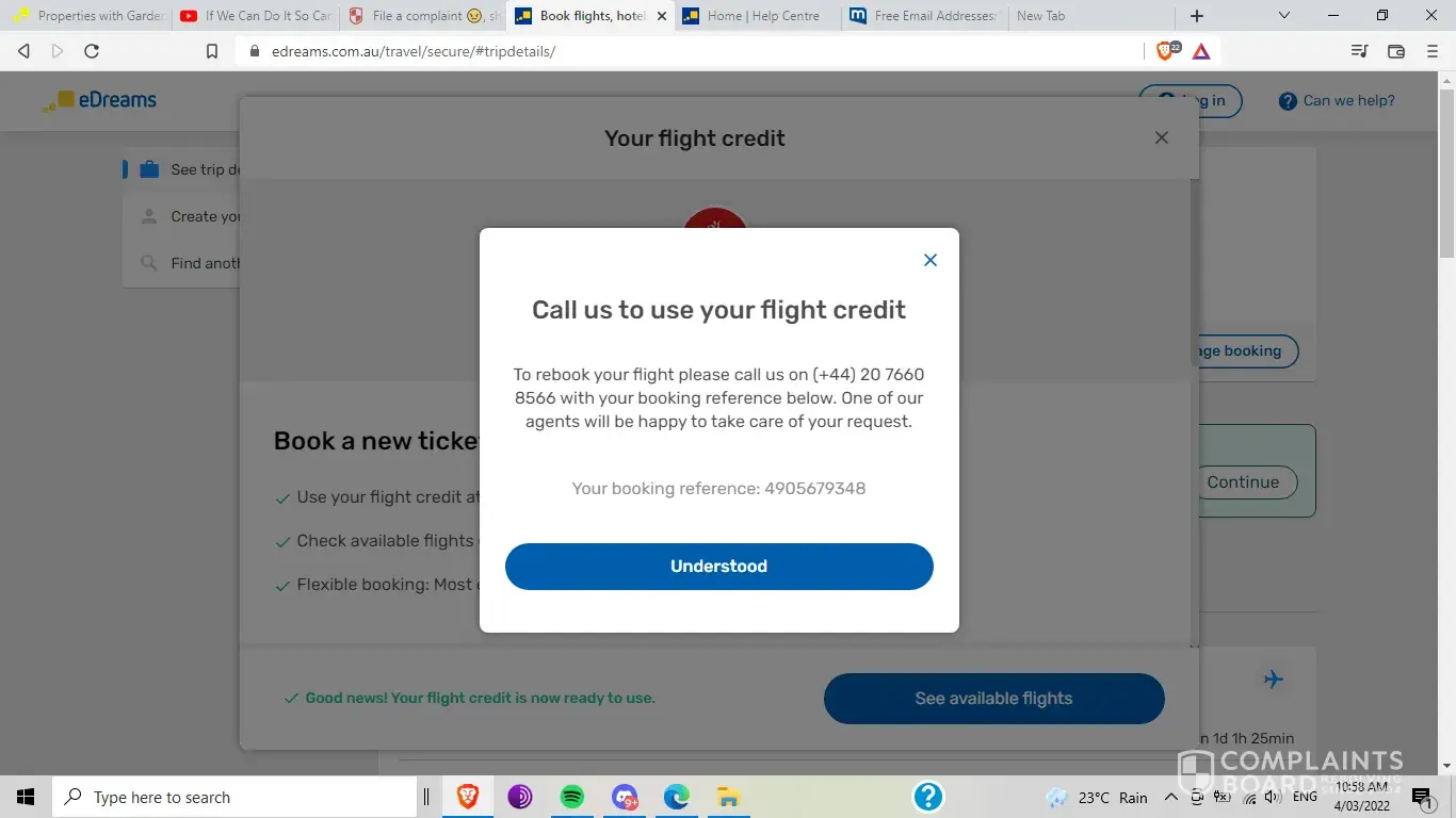 EDreams have not provided a satisfying service at all, actually creating me many more issues than expected, hence I should be at least fully refunded as soon as possible. This has also created many issues, financially and stress related, as I did have to spend an entire afternoon calling numbers abroad to sort an unpleasant situation out, a situation that EDreams has created and refused to find a solution for, while I'm feeling frustrated with the potentiality I would not be able to go home.