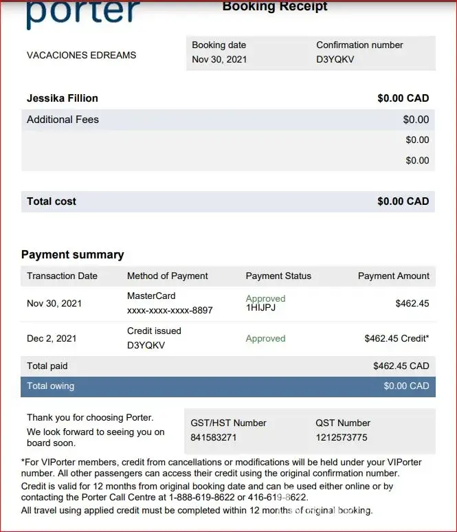 I booked my flight on Nov 30th 2021 (eDreams booking #[protected]; Porter booking# D3YQKV).