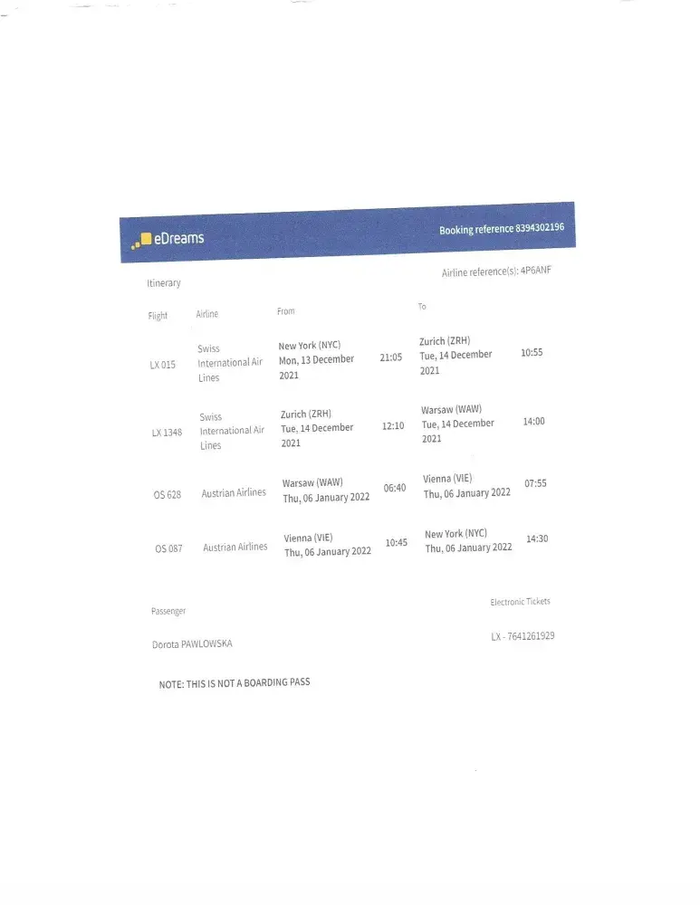 on 12/01/21 I bought a flight ticket from NYC to WARSAW and back/ booking ref.[protected]/ The problem started with the return flight. The flight nr OS 628 from WARSAW-VIENNA did not take place in general. I have lost conec tion with flight from VIENNA TO NYC/OS 087/I had no possibility of reaching Vienna. I bougt a new ticket from Warsaw to NYC. The Edreams Company did not inform me, that the flight from Warsaw to Vienna had been canceled. Olso Austrian Airlines did not inform me. They were very suprise, that my flight were canceled. I called Edreams and AA, but they did not help me. So I expect compensation for additional costs and health.