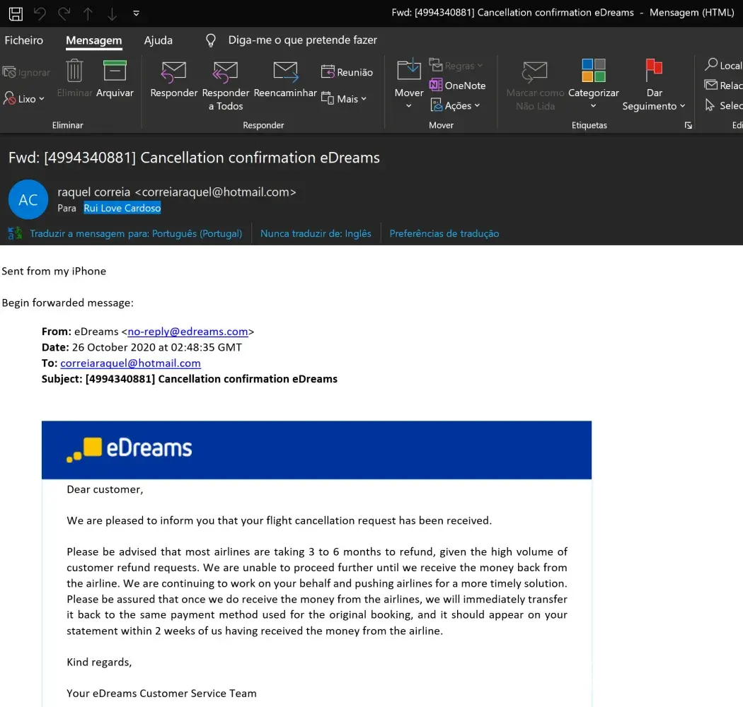 Comprei através da agência edreams, voos para 4 pessoas, para as minhas férias em Dezembro de 6 a 10 de Dezembro, comprei em Setembro com 3 meses de antecedência porque so organizada edream confirmo tudo ok. mas depois a agência wizz comunicou via gmail, dizendo que mudaram as datas da viagem, não posso viajar em outras datas, por isso liguei e pedi para ser resolvido - não tinham para as datas indicadas. e devo solicitar o reembolso - Fiz mais. Não devolvem o meu dinheiro porque não fui eu que o comprei.isso foi edream Entre em contacto com a edream e dizem-me que não podem reembolsar- que o wizz tem de fazer uma carta de autorização, gastei 9 euros em cada chamada e explicações, Voltei e liguei para o wizz eles falam que não fazem nenhuma carta que o edream deve preencher um formulario e pronto, eles automaticamente me fazem o reembolso, edream nao quere tal formulário diz que não preenche nada sem a autorização prévia da wizz estou assim desde setembro ja estamos em 23 de 11-2021 minhas ferias estão se aproximando e não consegui meu dinheiro e Não é justo quando não fui eu que mudei, foi o wizz que mudou tudo, obrigado pela ajuda imediata. Quero resolver porque a minha feira está se aproximando e comprei muitos voos com vocês de Portugal para a Colômbia, tive respeito pela sua agência, me pareceu o melhor, mas agora que outra agência como a Wizz muda as datas criando um problema, você tem que resolvê-lo como uma empresa.