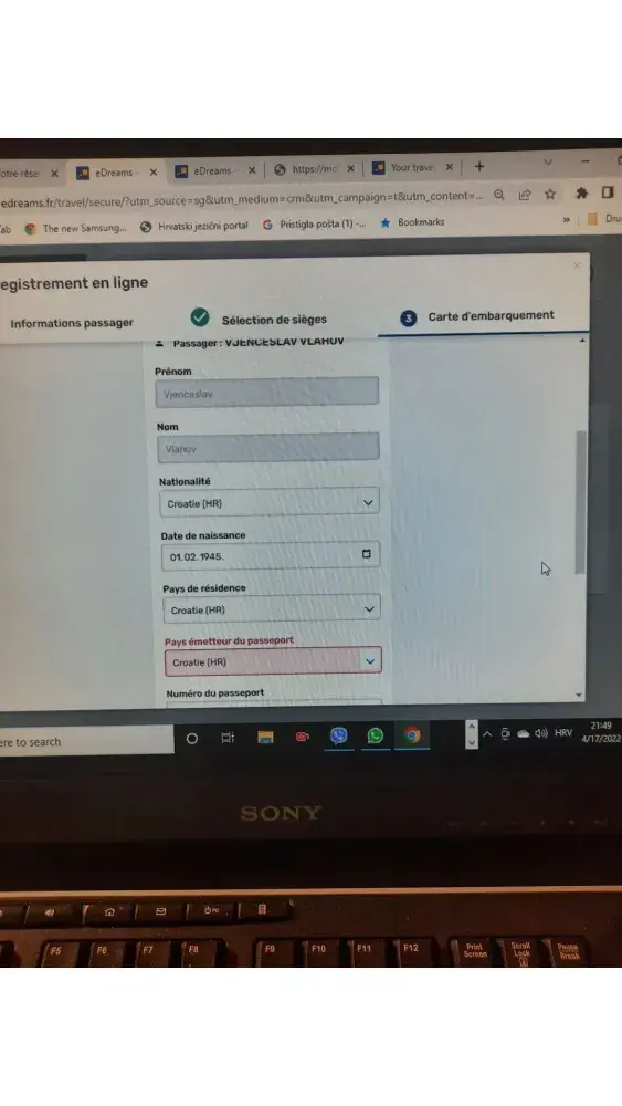 Trying to accomplish my check-in for the flights Zagreb-Paris-Zagreb on 5th May 2022/17th May 2022 my efforts have been stopped in the part "Pays emmeteur du passport", where my correct response "Croatia" has been marked RED (see the added photo), which stopped me to continue. What I have to do in this case?