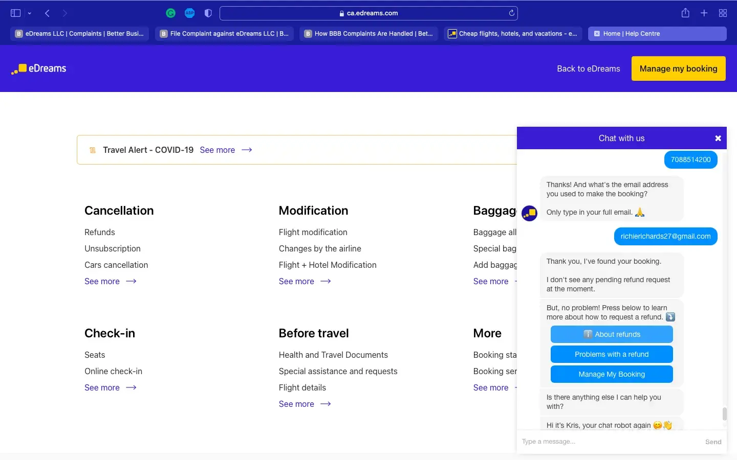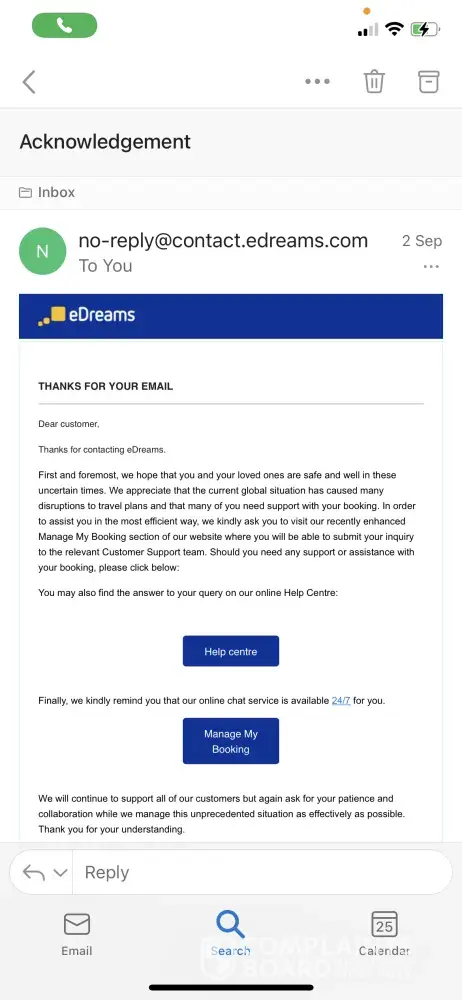 14 October received email from [protected]@contact. edreams.com : "Thanks for contacting eDreams… ask for your patiences while we manage this unprecedented situation"