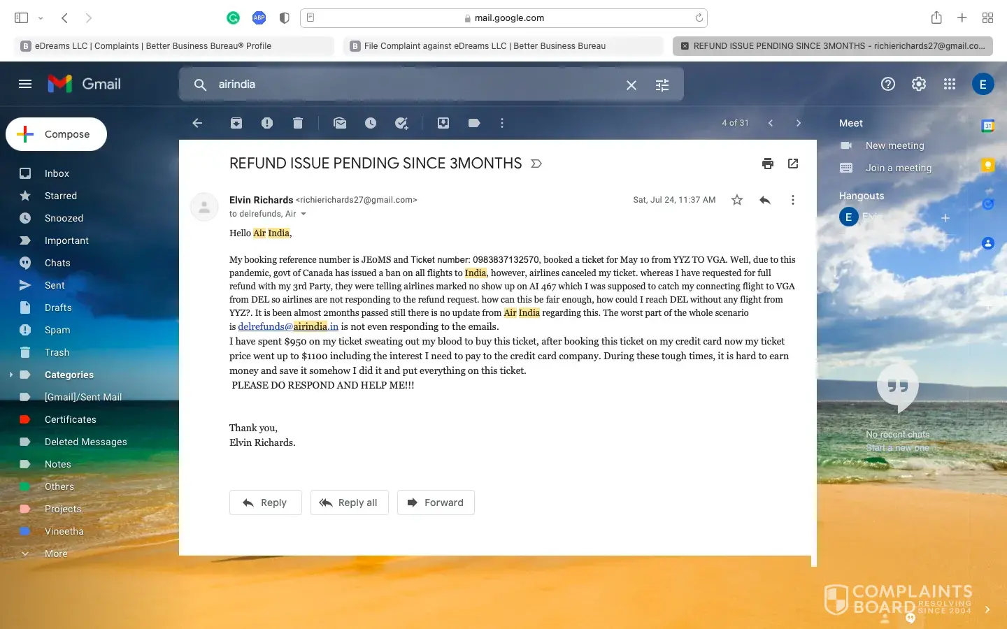 Booked ticket from yyz (india) to del (india) to vga (india) for 10 may 2021, booking ref : [protected] due to flight ban airlines cancelled the ticket, since there is a ban I couldn't able to fly del (india). So airlines marked as no show at del (india) and closed my case. How can that be possible. How can I travel to del without any flights, and I immediately requested refund once flight ban is announced edreams said it will 90 days, it been 6 months I am still waiting for the refund. I ve contacted airlines was saying tell travel agency to contact us directly. I ve reported the same to edreams they were saying we are not able to contact the airlines. I am calling them everymonth still there is no update. This edreams stole my money.