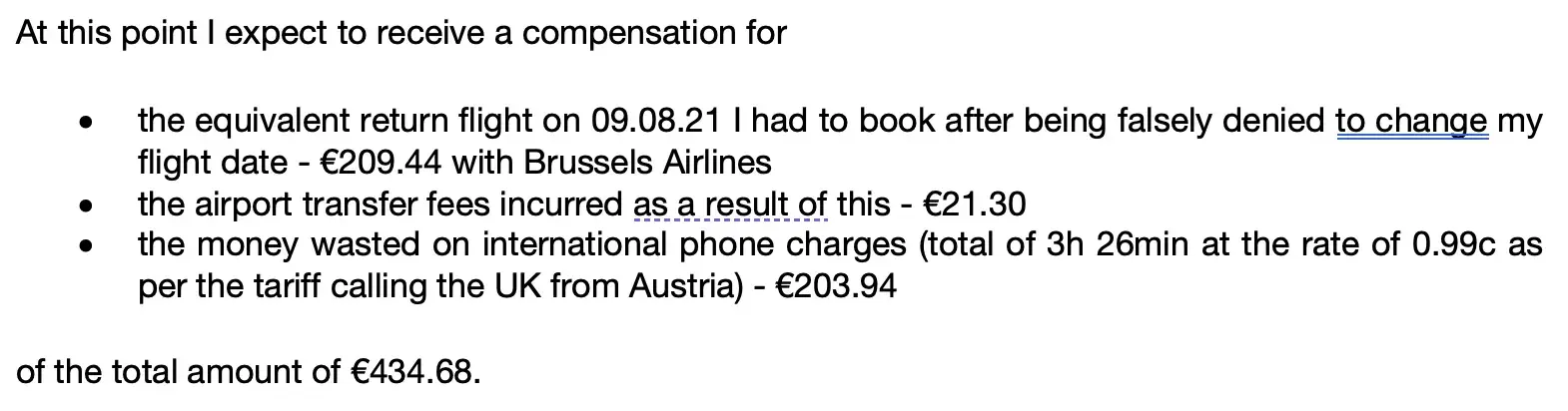 Desired outcome: Compensation of €434.68 (breakdown in photo)