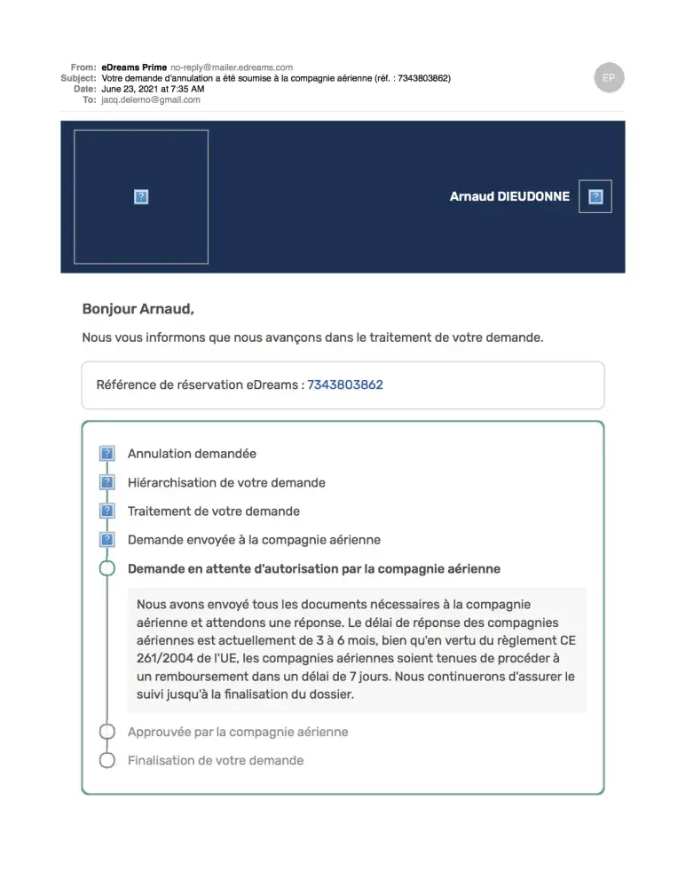 23 June, received email from eDreams : "Airline has approved refund, and we await your refund in cash … airlines take up to three weeks to refund. We will inform you once we have received your refund"