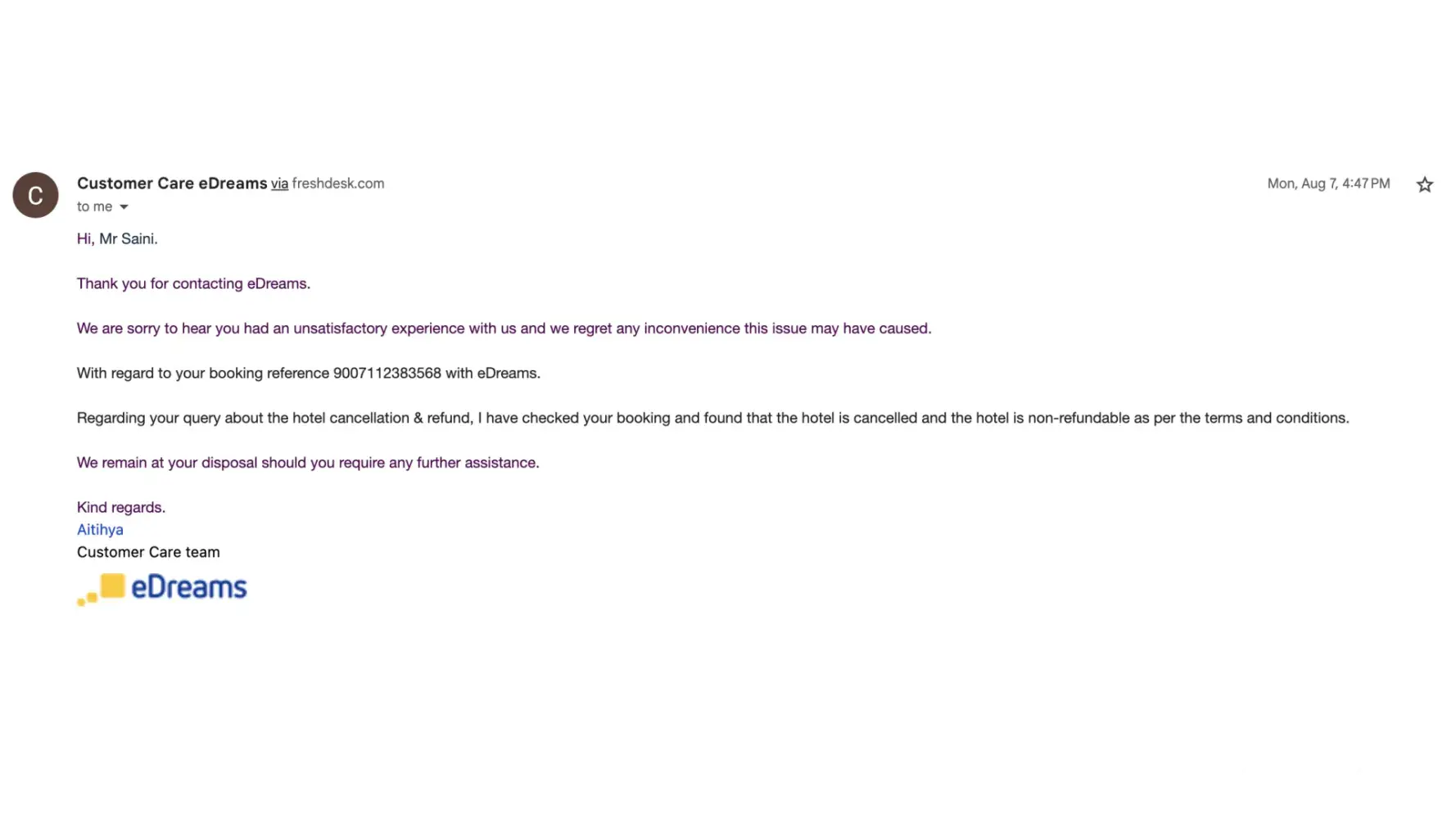 In the first place, One of the eDreams customer support person(Aitihya) shared an email with me saying that they didn't find my accommodation booking reference number. Also Aitihya stated that it’s not refundable however during my booking confirmation its clearly mentioned that it’s 100% refundable if I cancel before certain date.