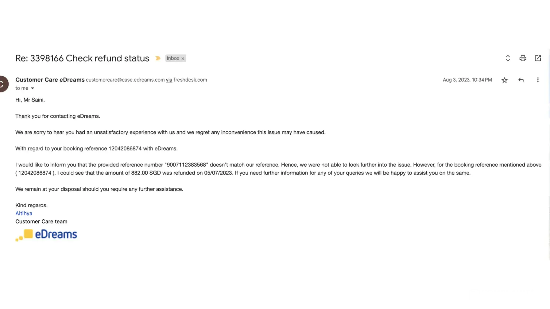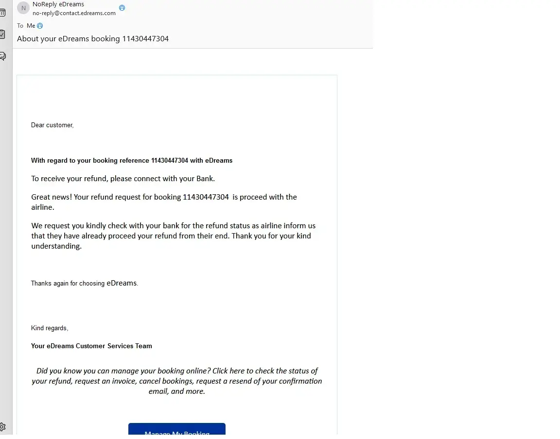 It is with much disappointment that I have to inform you that I really can't digest weird eDreams Customer Support responses regarding my refund status.Â