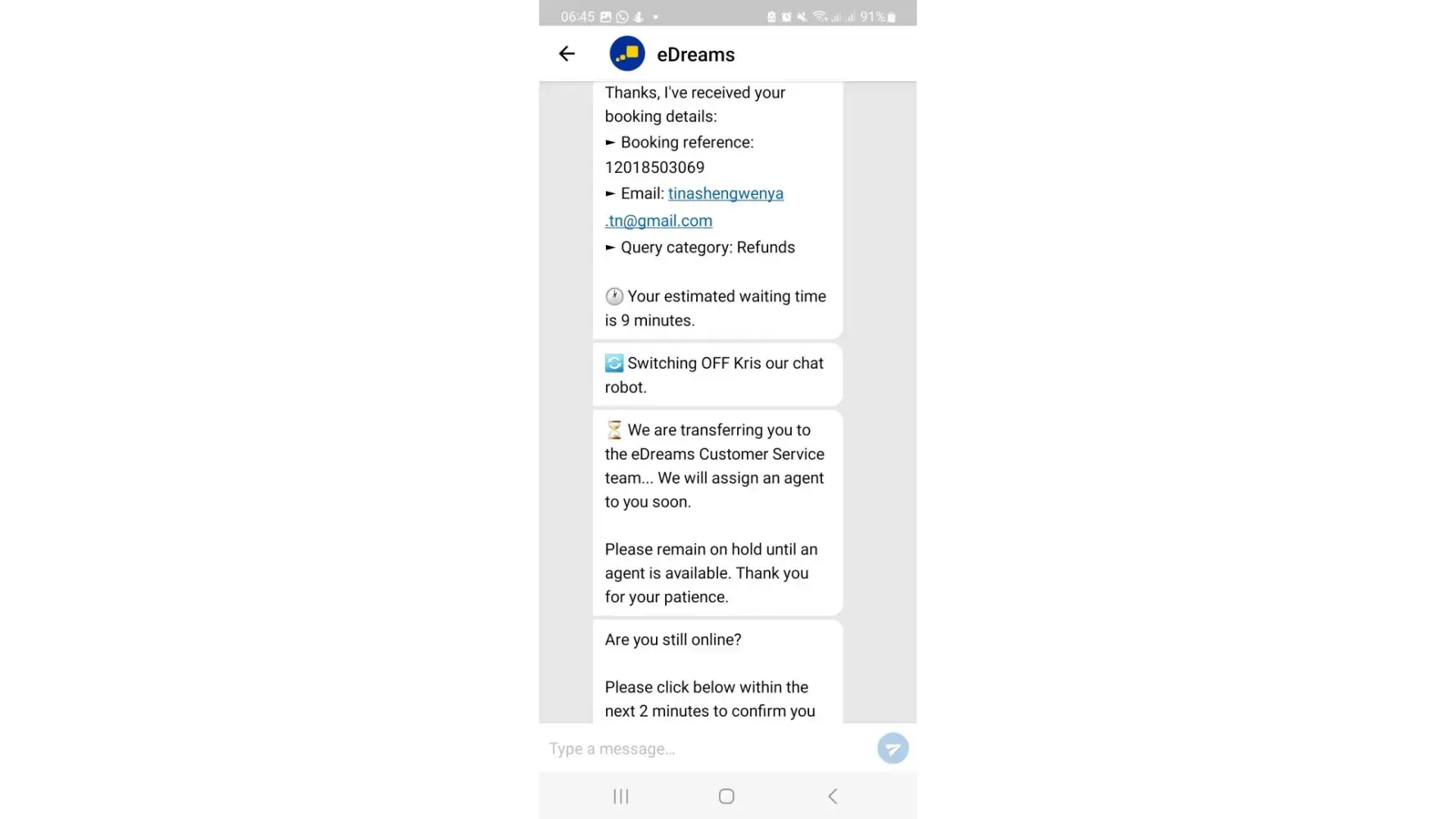 A few days later, I got one more email eDreams customer support person(Mohammed) saying that I have to reach out to Booking.com for my refund. He provided me Booking.com contact no +[protected] in the email to get my refund. As per Mohammed's suggestions, I called Booking.com and they said we don't have such booking details and any partnering with eDreams.