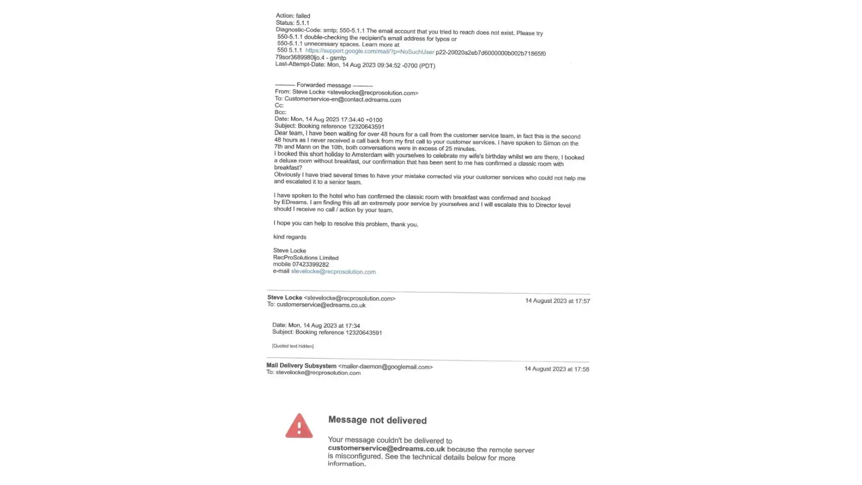 I have copies of emails sent to the advertised email address of E Dreams which were bounced back, plus the 2 separate calls made to the customer service team where I was promised a call back but never received either?