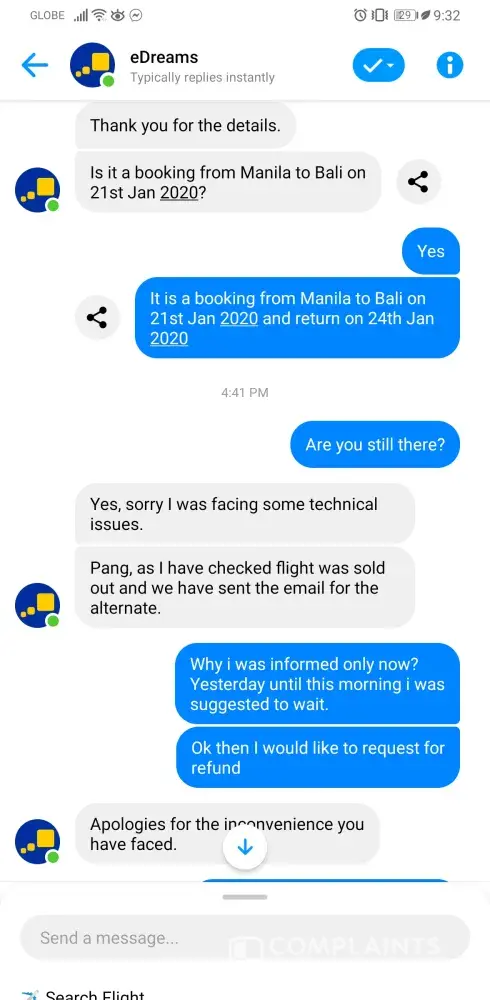 I booked a roundtrip flight from Manila-Denpansar through Edreams on Jan 14, 2020. After 24 hours of waiting, I talked to their agent asking for the booking status. He replied that after checking the flight was sold out. They got the payment already. Now, I request for refund and told me that the process will take 72 hours. After you took my money in just a minute, please return my money as soon as possible.