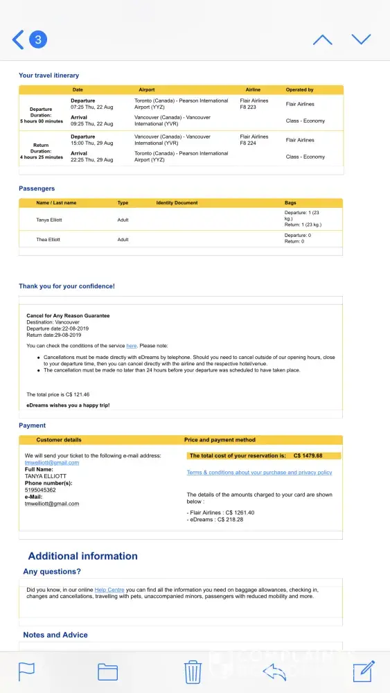 I purchased return tickets from Toronto to Vancouver on July 17 2019 through Edreams for Flair airlines. Bought the optional cancellation for any reason insurance. On July 21 contacted the company to cancel the flights. They told me that they could give me a refund for the majority of the charge ($1009.12). They would not refund it to my MasterCard (the method used to purchase the tickets). Said I needed to provide them with bank account info and that the refund would happen within 7-10 days. I reluctantly gave them the requested information. 14+ days later no money has been transferred. I called the company again (average time on hold for each call is approximately 45 minutes) and they said that the money has been transferred. The person I spoke to said something unclear about making a complaint on the website. I see nowhere on the edreams website to make a complaint. I called again and was asked to call back tomorrow because the finance department is currently closed. Followed up again mid August. Spoke to someone who asked to confirm our bank account information. The information they had for us was completely incorrect. Provided the correct bank account and IBAN number and had employee read it back to confirm that it was correct. On August 18, received an email from edreams saying that our request for flight cancellation request had been received and that ‘Once the payment is processed, the amount will be refunded back to the same payment method as in the original booking.' We still have not received our refund.