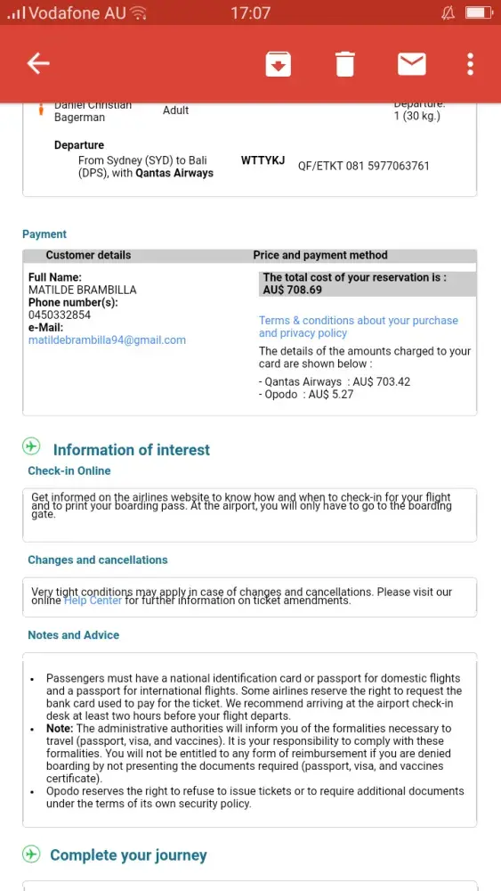 I've booked on opodo a one way quantas ticket sydney-bali for 2 people for the 20/3, single price 350$ total cost of the reservation on the receipt (see picture) 703$, but on my bank account I've been charged 1410$! I tried to solve it through the e-dreams call center but with just the suggestion of claim online.