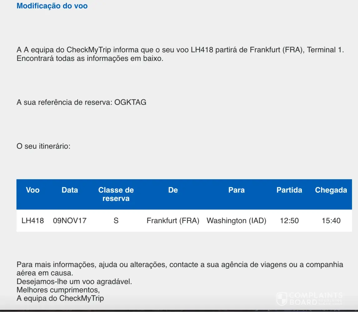 I got to Washington and with some surprise I got this email (exhibit 4) on the 7th of November, stating that a flight from Lisbon to Frankfurt was scheduled to leave on the 9th of November. This is obvious an error from Edreams since I was already in Washington and explicitly said that I didn't any of the options the agent offered me. It's on record.