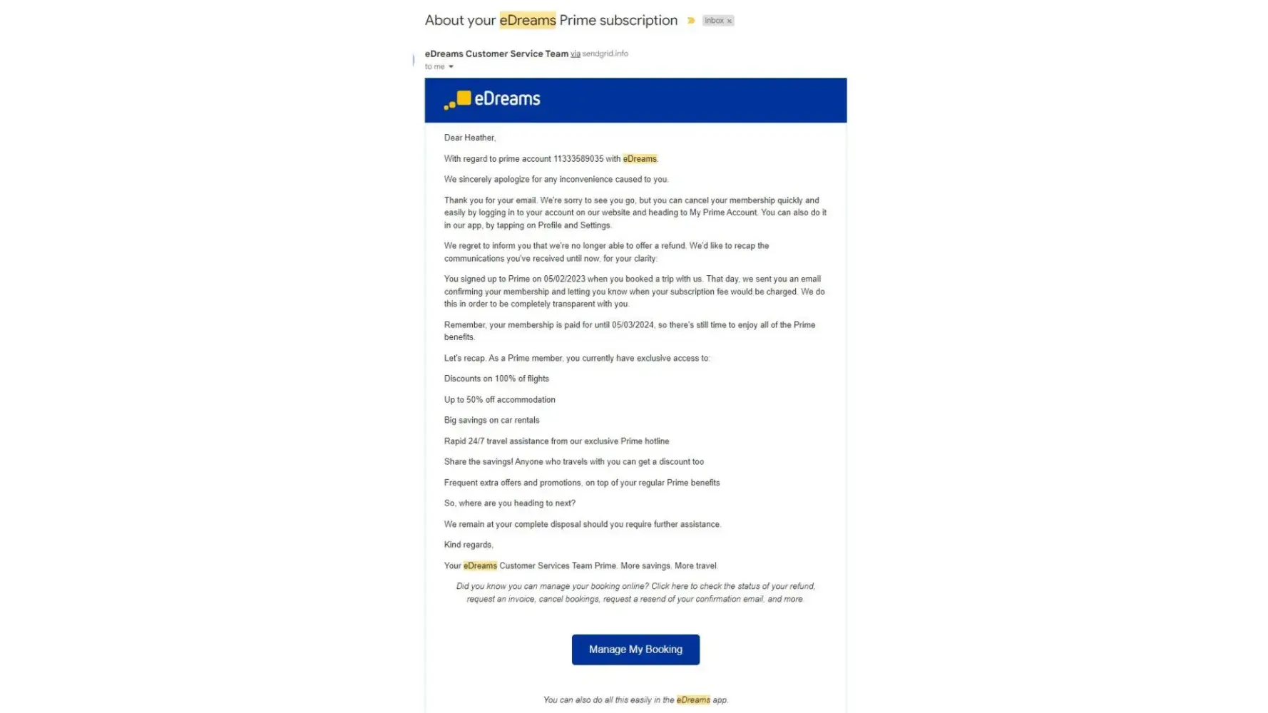 I was overcharged for a trip from LUN to JNB in May 2023 worse still on 26 June 2023, my account was debited by k1200 saying since l used their website to book proflight they automatically subscribed me to edreams prime with subscription fee unawares.