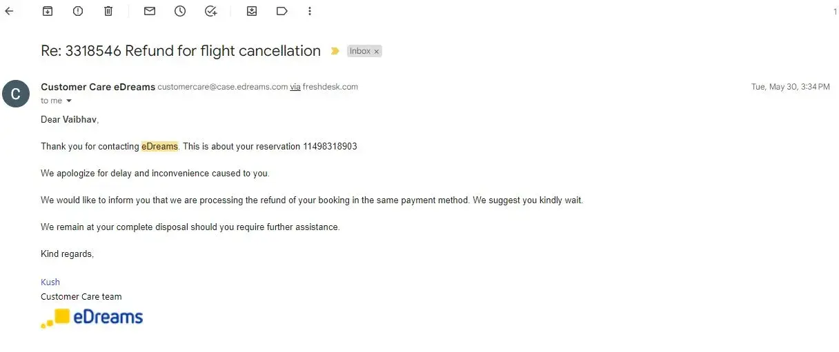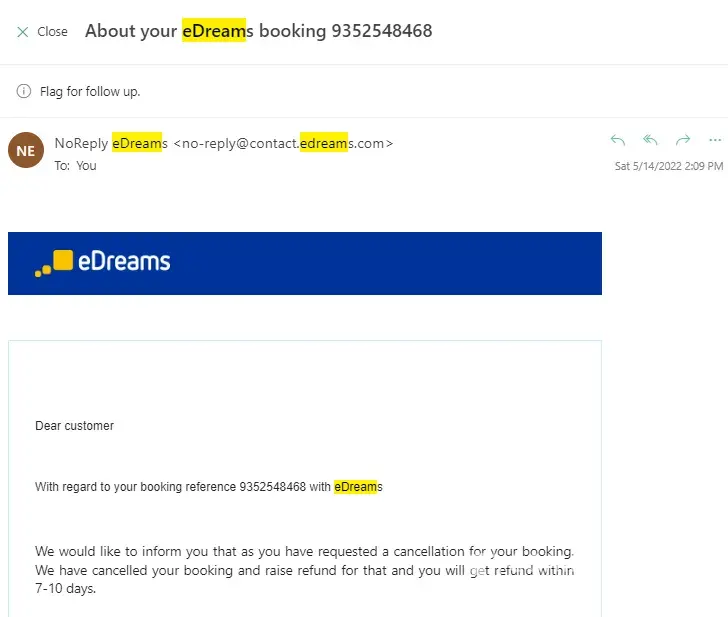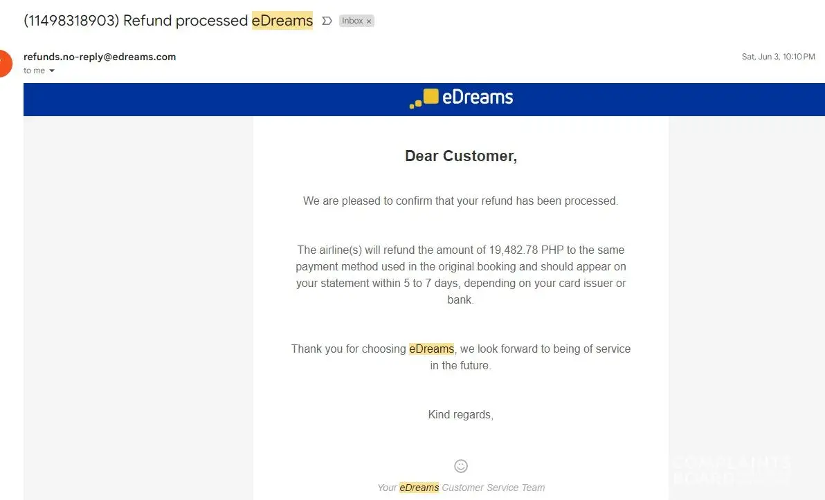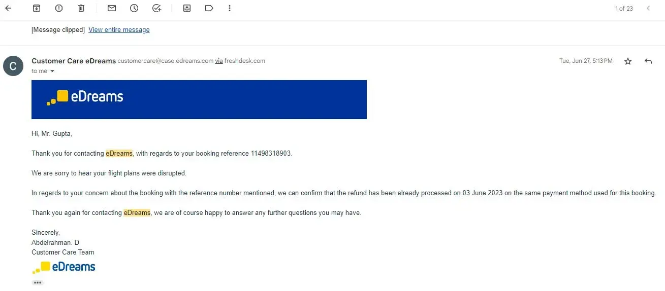 On 3rd June, I received email from edreams that Amount has been refunded.