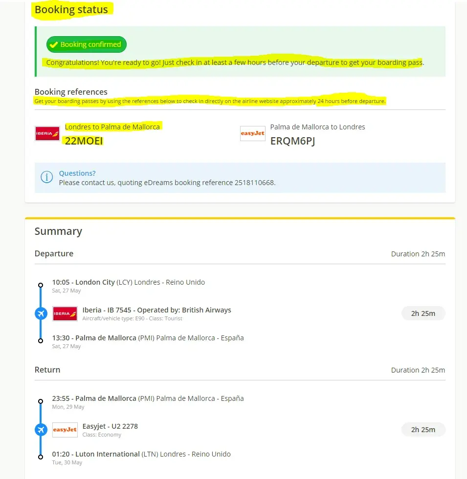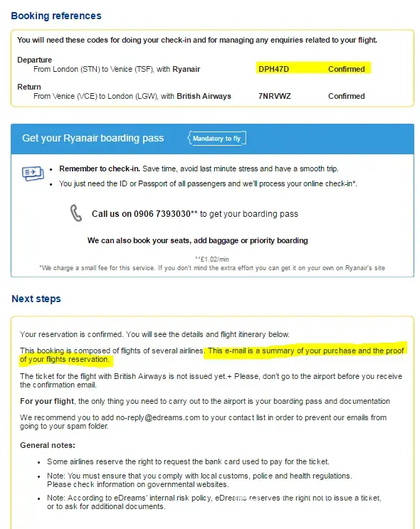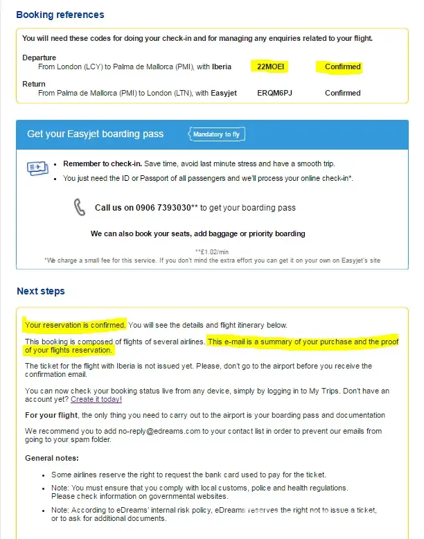 - After that, eDreams sent me a confirmation email for both fights, that states This eÂmail is a summary of your purchase and the proof of your flights reservation and that, whether if they really did it or not, informs me of The details of the amounts charged to your card:  Iberia : £ 191.40  eDreams : £ 118.4