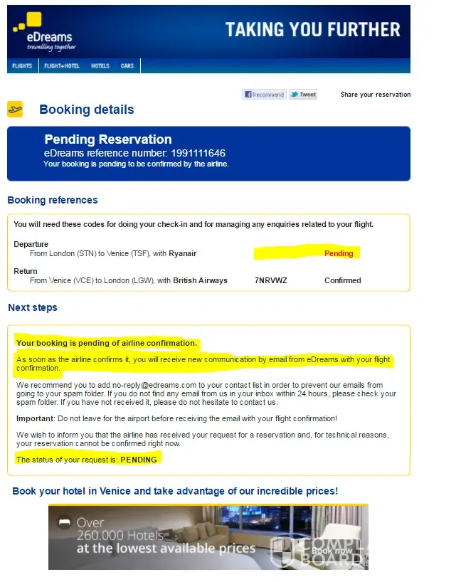 c) To highlight the difference with a reasonable case, please find attached previous reservation I made also with eDreams in the past, in which, on the contrary of the current occasion, one of the flights was pending after I made my booking with eDreams. You can see how it is clearly expressed already from the subject of the email and afterwards in red that: