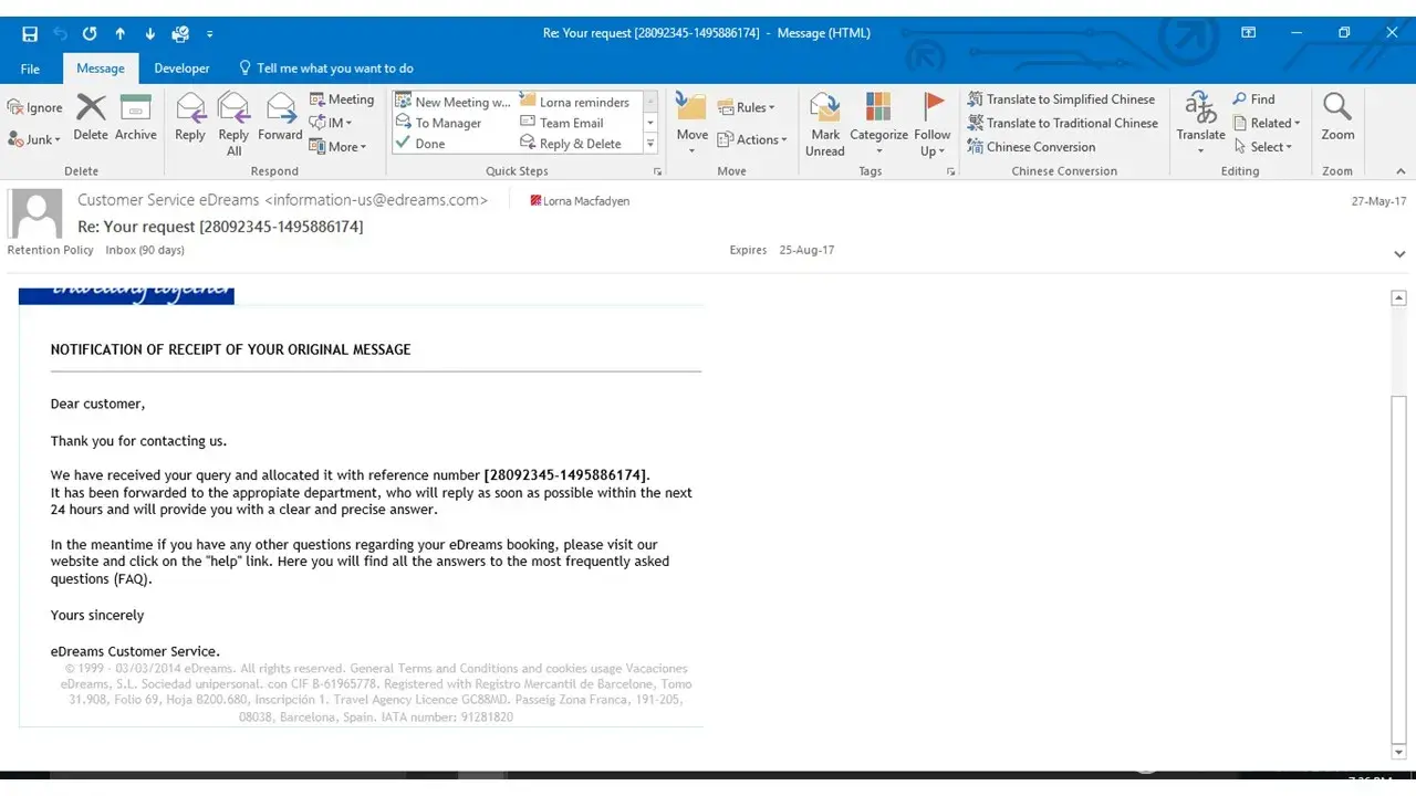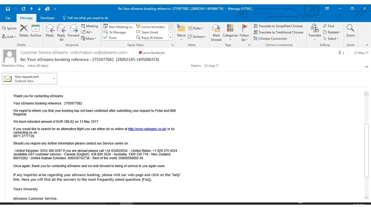 Please find below now the answer eDreams customer service give me to this email: