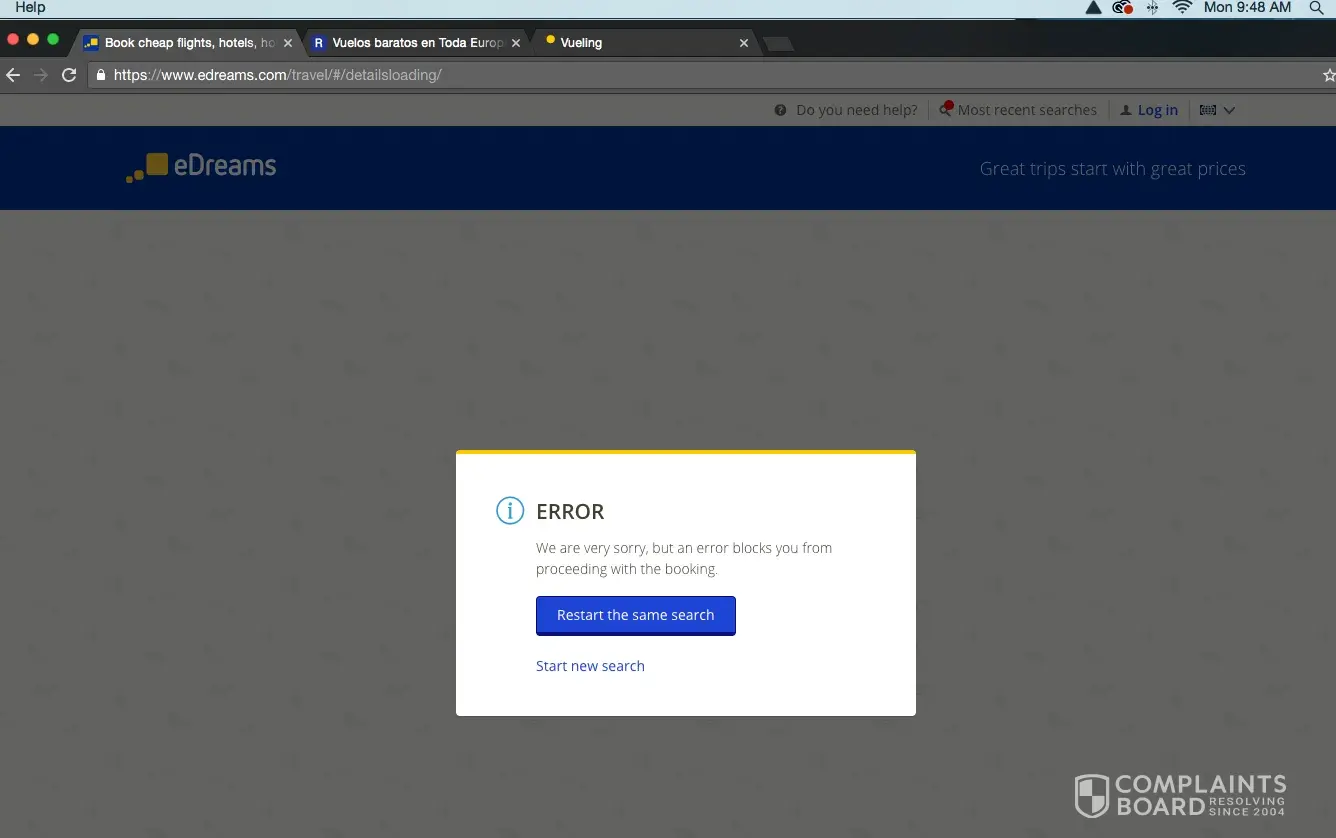 Bough 3 flights Barcelona-Seville-Barcelona on November 7, 2016 to fly in February 2017. Got an ERROR message saying "We are very sorry, but an error blocks you from proceeding with the booking." The options available were "restart the same search" or "start new search". Got this on a screen shot to show. Since according to the message the booking had not happened I went ahead and booked directly with Vueling. Edreams combination was flying via Vueling going and returning via Ryanair.