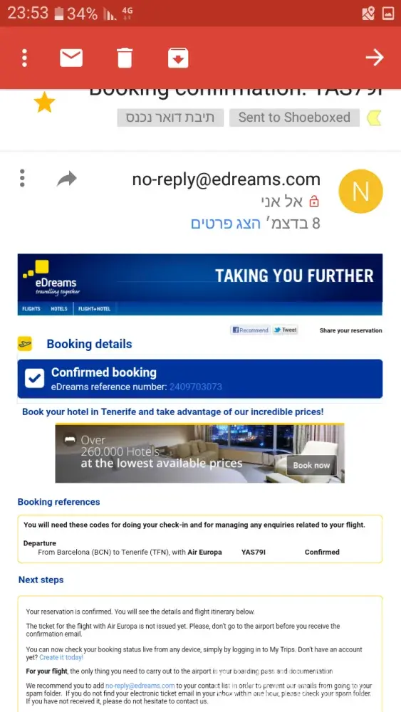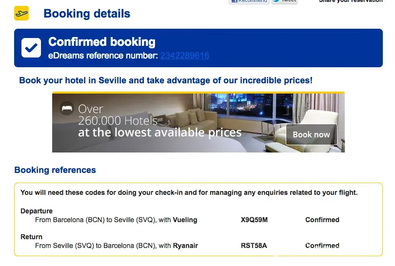 Later, I got a confirmation email from eDreams that the booking had gone through and charged my debit card (I use debit for traveling). I do not need to fly twice on the same dates!