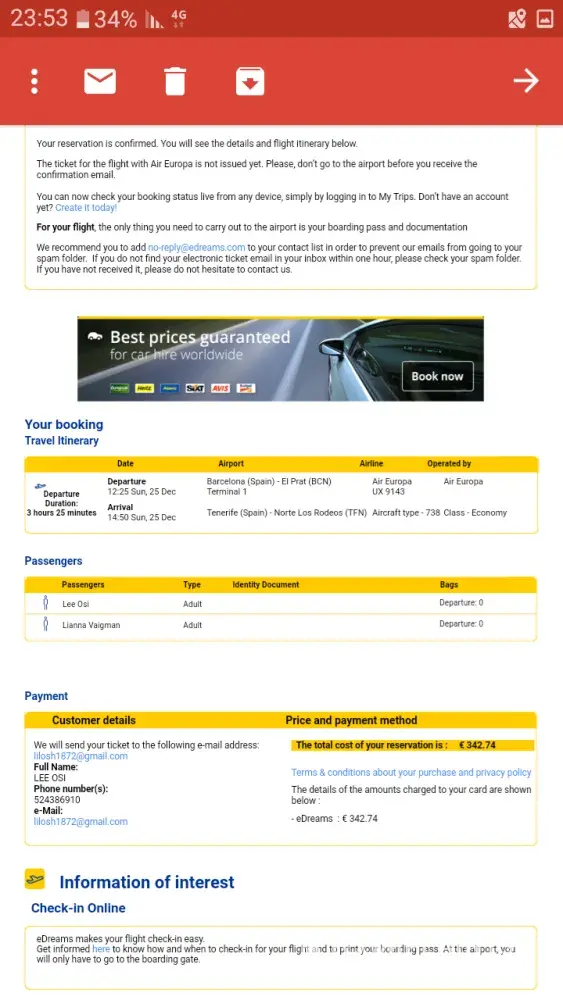 On 8 Dec 2016, I made a reservation on your website for 2 passengers (myself [Lee Osi] and my partner [Lianna Vaigman]) for a flight from Barcelona to Tenerife for 25 Dec. Just afterward, my credit card was charged for the tickets, and I received an email confirmation for the reservation, which was the only email I ever received from you about this booking (see the attached screenshot).
