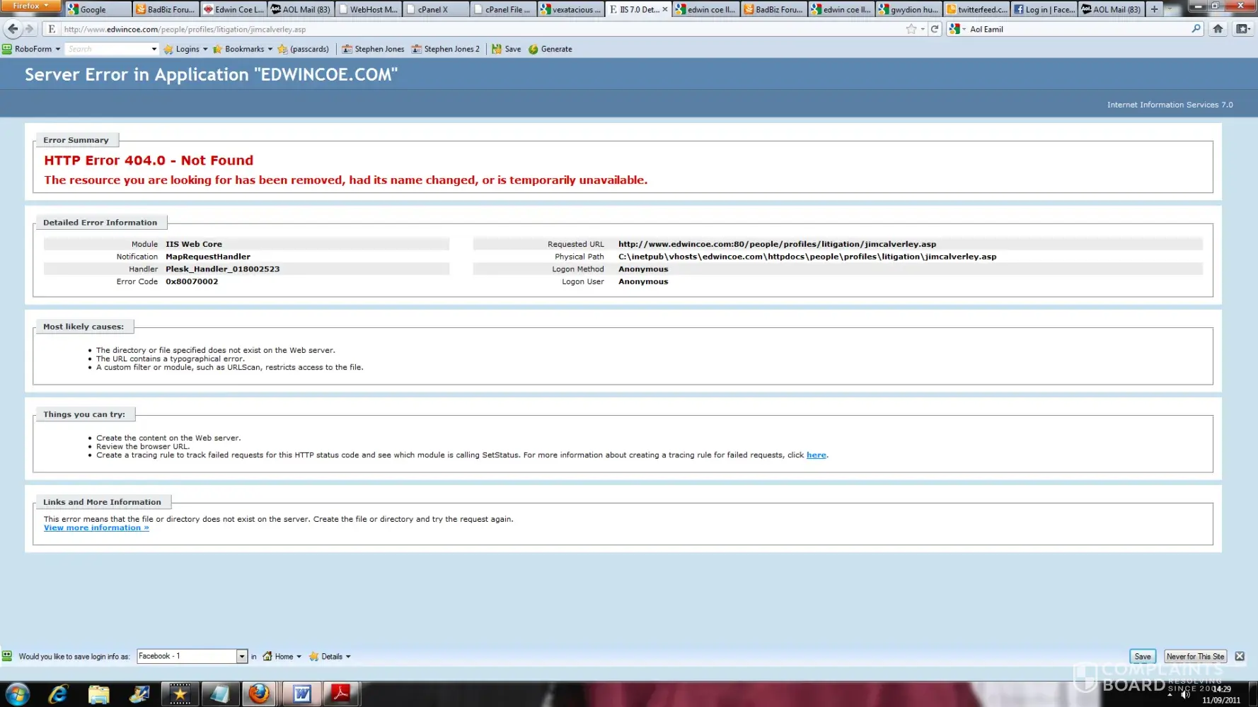 Its using a Plesk Handler to produce a 404 error page in respect of a link to Jim Calverly’s page which has obviously been removed.